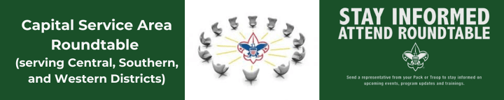 Welcome to our monthly roundtable meeting offered by Capital Service Area (Central, Southern and Western Districts) that gives leaders hands-on experience and provides a forum for leaders to offer and receive help from their fellow Scouters.