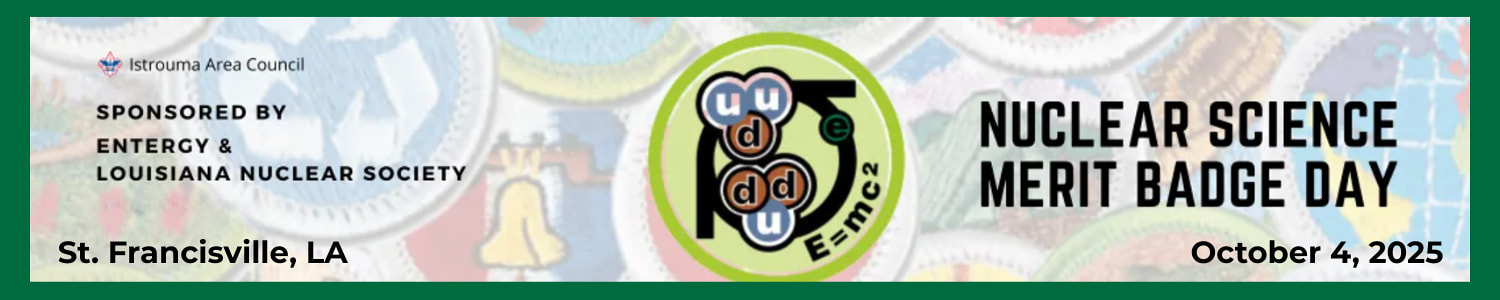 Registration starts at 8:30 am and is open to all Scouts BSA. Registration because of the size of the classroom is limited to the first 66 scouts. Lunch and the Nuclear Science Merit Badge Book will be provided and are sponsored by Entergy and Louisiana Nuclear Society.