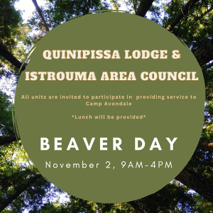 We are holding a major Service Day in November. This service day will be hosted by the Quinipissa Lodge and is open to all Arrowmen, and everyone in your unit. Yes, this service day will be Council-wide. Istrouma Area Council and Quinipissa Lodge would like you to join us on Saturday, November 2nd from 9:00 AM - 4:00 PM as we participate in a couple of Beautification Projects at Camp Avondale.